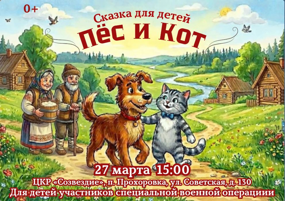 Центр культурного развития «Созвездие» приглашает вас на спектакль «Пёс и кот». Этот показ мы приурочили к Всемирному дню театра, который отмечается 27 марта. Мы хотим, чтобы вы — наши маленькие зрители — почувствовали волшебство сцены и окунулись в мир искусства. Эта светлая, добрая постановка обещает подарить вам улыбки и хорошее настроение. Вы отправитесь в увлекательное путешествие, полное добра, дружбы и настоящих сказочных чудес. Добро пожаловать в мир театра 27 марта в 15:00 в концертный зал Центра культурного развития «Созвездие».Показ состоится для детей участников специальной военной операции.
